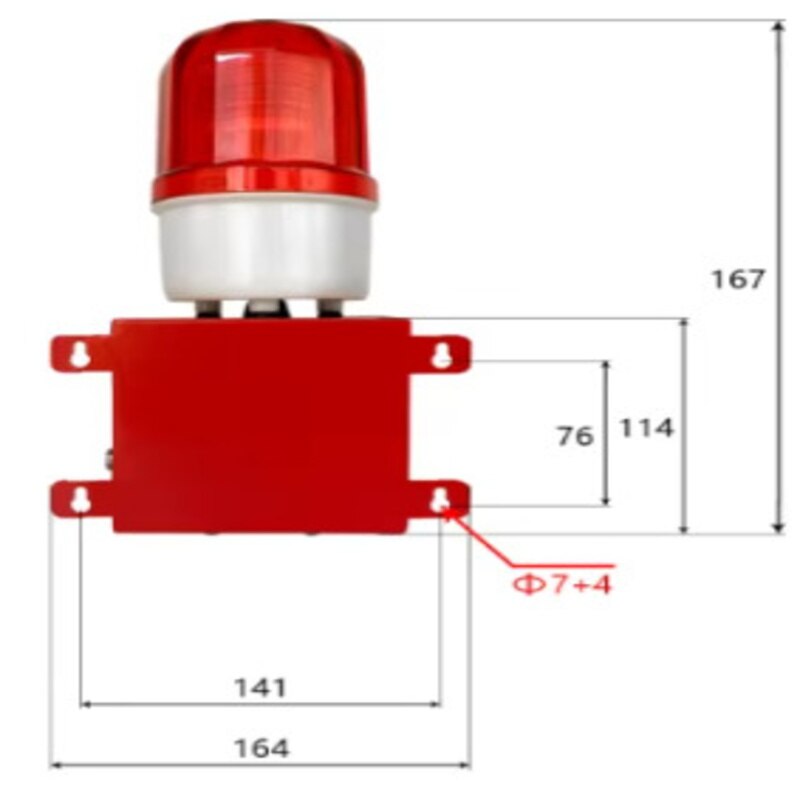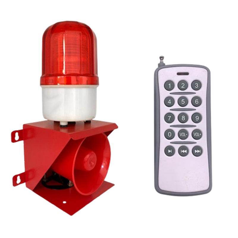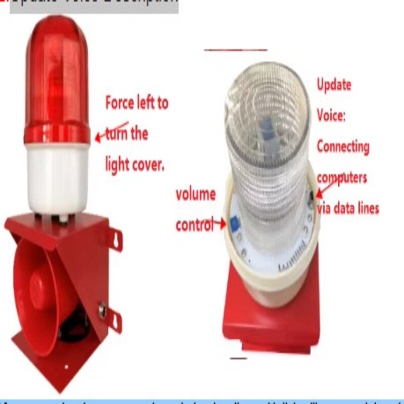 ● 24W 120dB waterproof wireless industrial alarm with remote control, designed for outdoor use. It combines sound and light alerts, supports custom voice content, and offers multiple playback modes including loop play, microwave induction, and remote-controlled operation. Suitable for hazardous areas like construction sites, it ensures high-power warning signals with flickering alarm lights during broadcasts. The device operates under extreme conditions with a temperature range of -40°C to +85°C and supports easy voice updates via USB connection. ● Working voltage:DC12,DC24V,AC220V ● Rated output power:15W(RL=8Ωd=1%) ● Sound pressure: About 120DB ● Maximum operating current:1500mA ● Working environment temperature:-40~+85℃ Industrial standard Working ● environment Humidity:10%~98% ● Brown: power supply positive pole; ● Blue: power supply negative pole.